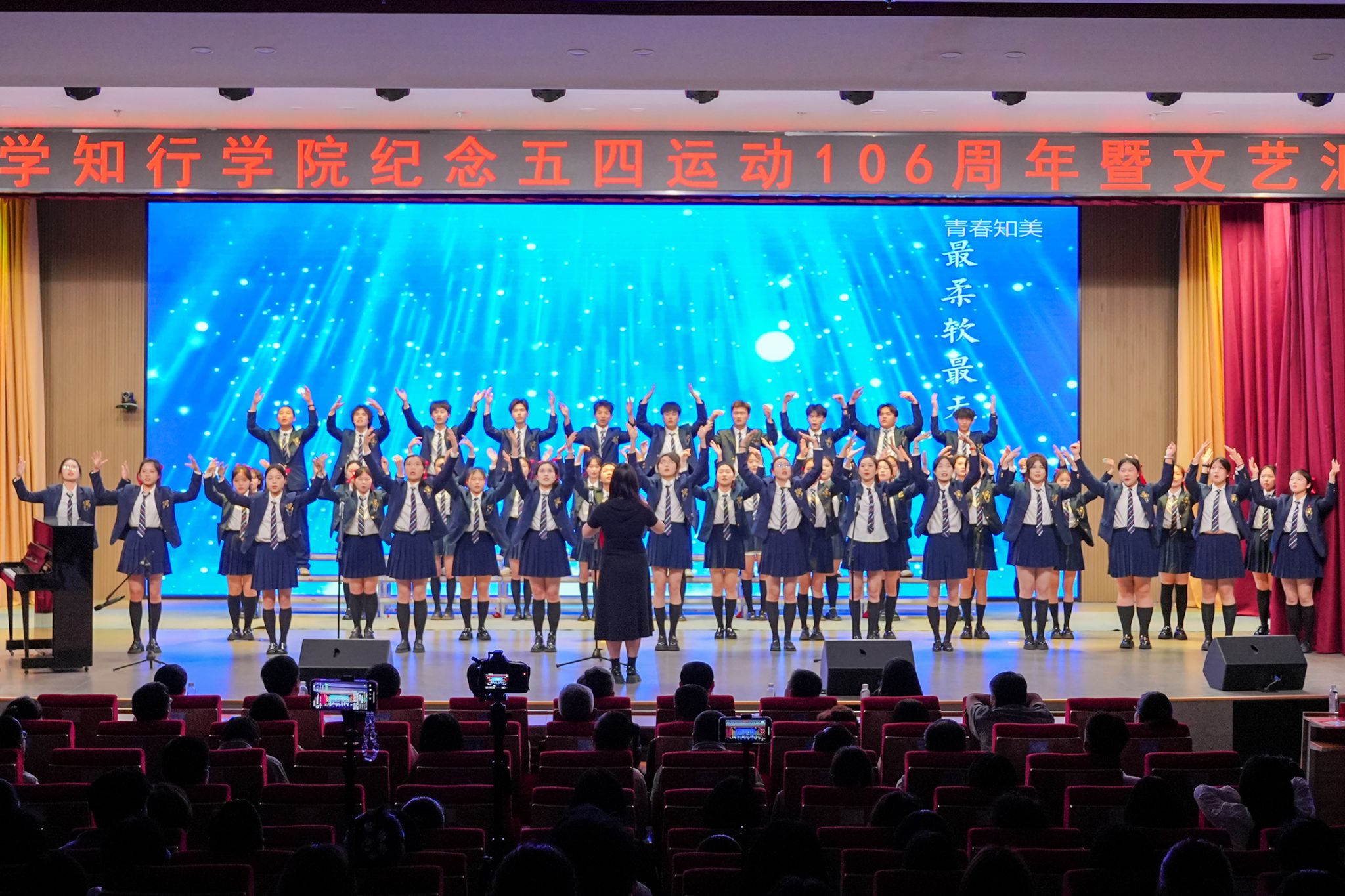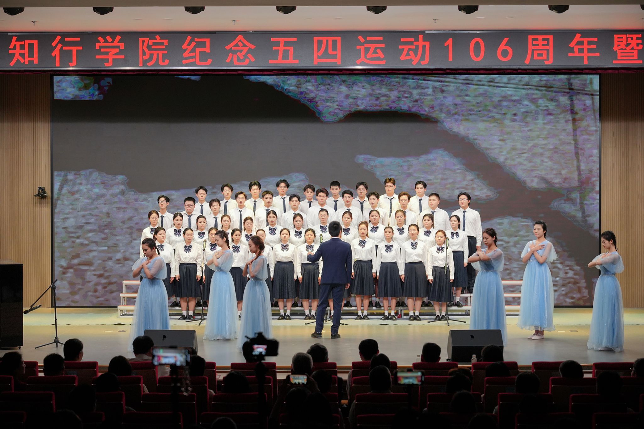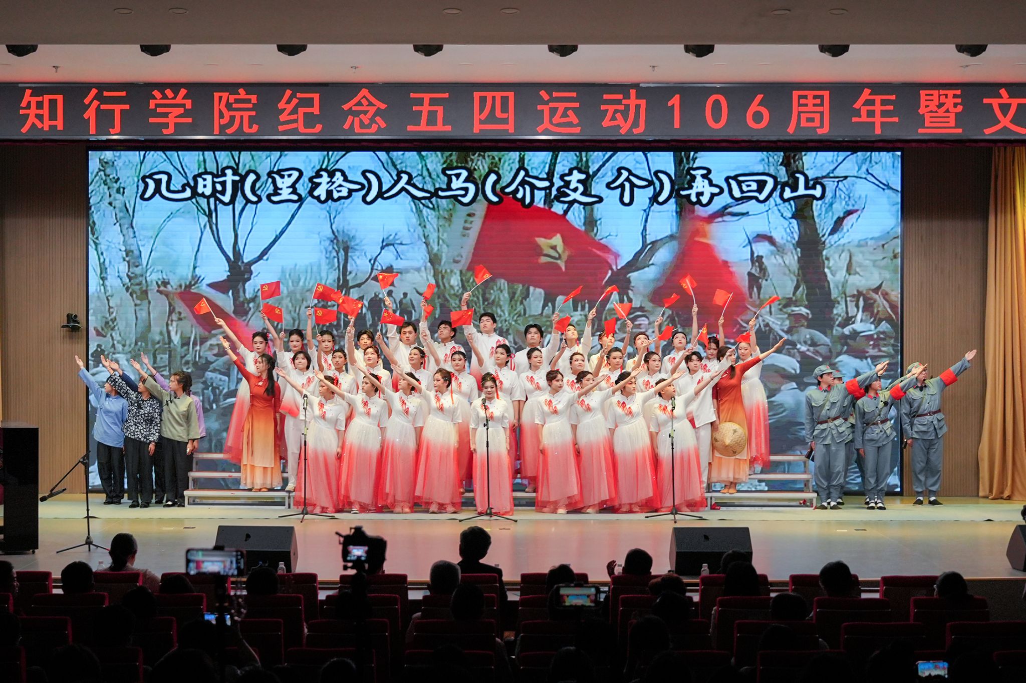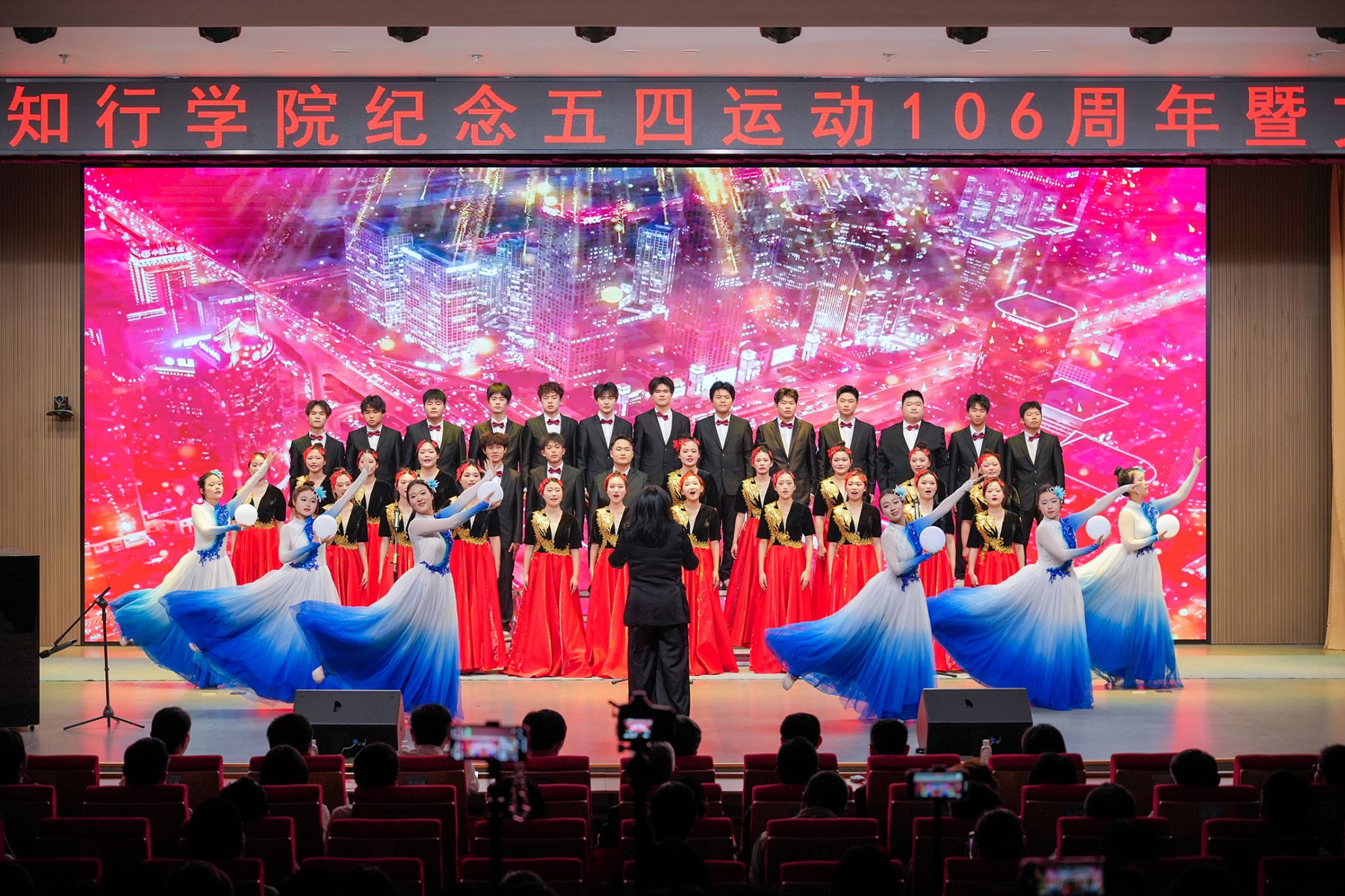 表彰大会后,文艺汇演正式拉开帷幕。校艺术团的舞蹈《觉醒年代》《盛开》、校广播台的朗诵《山河回响》展现了不同时期青年的使命与担当。随后,九个二级学院的合唱队依次登台献唱,参演学子用歌声展现青春活力,表达了对祖国的热爱、对知行的深情、对青春的赞美与对美好的向往,体现出新时代知行学子昂扬向上的精神风貌与砥砺奋进的意志品格,歌声催人奋进,气势振奋人心。文艺汇演最后,校艺术团的合唱《有我》和教职工的合唱《海阔天空》将表演推向高潮。