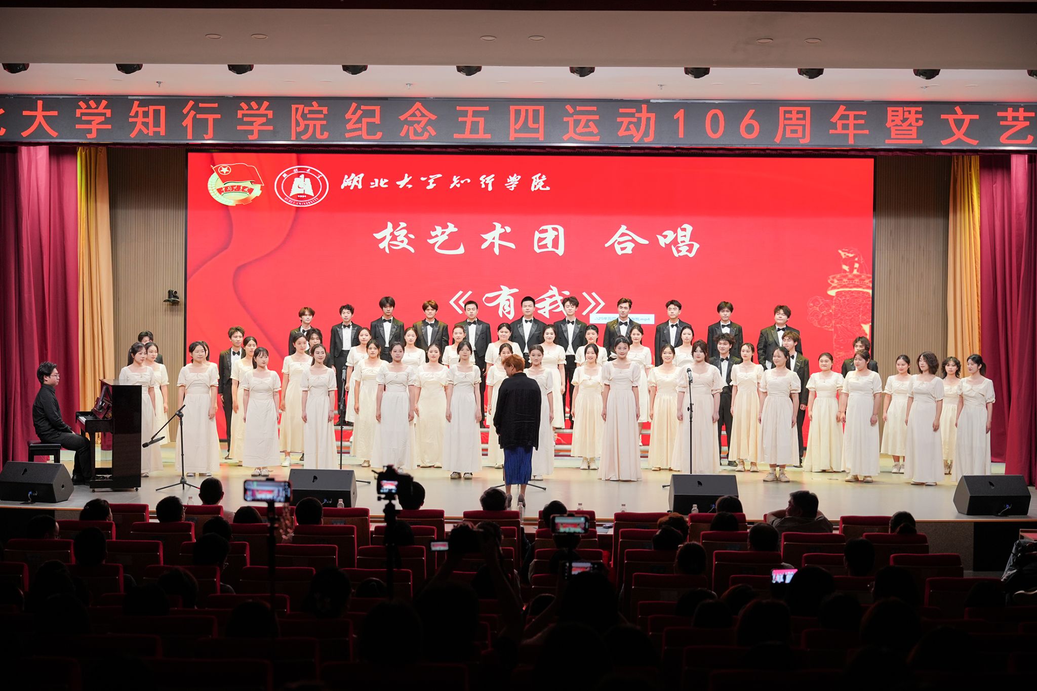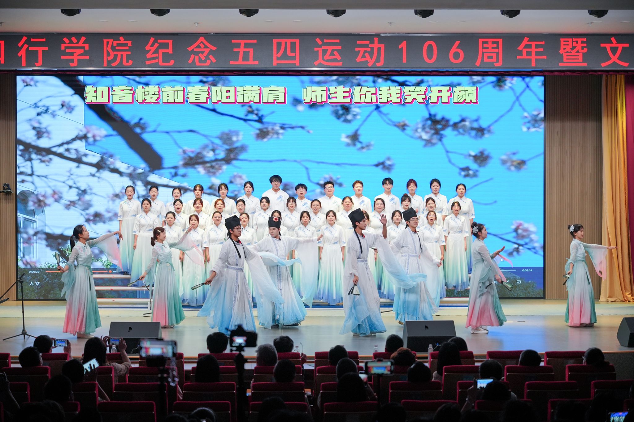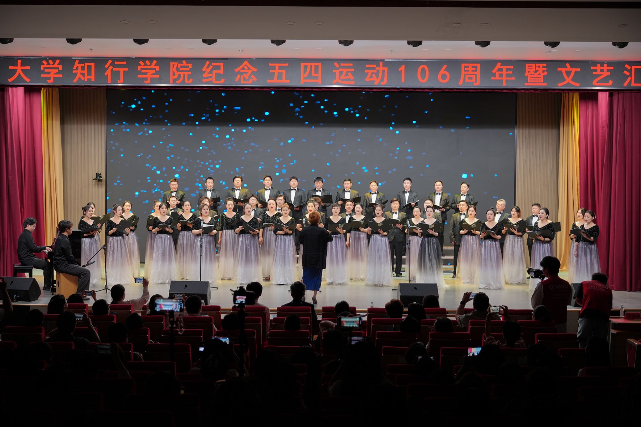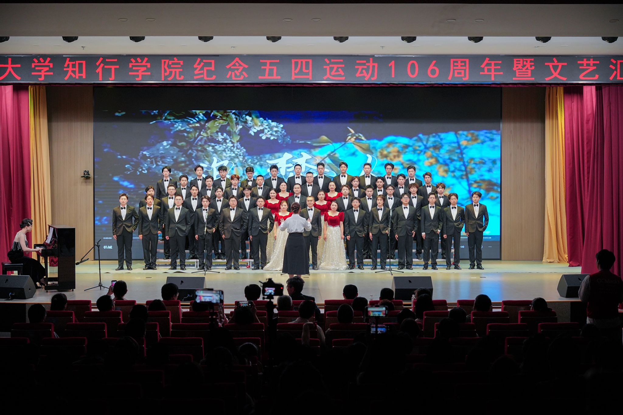 表彰大会后,文艺汇演正式拉开帷幕。校艺术团的舞蹈《觉醒年代》《盛开》、校广播台的朗诵《山河回响》展现了不同时期青年的使命与担当。随后,九个二级学院的合唱队依次登台献唱,参演学子用歌声展现青春活力,表达了对祖国的热爱、对知行的深情、对青春的赞美与对美好的向往,体现出新时代知行学子昂扬向上的精神风貌与砥砺奋进的意志品格,歌声催人奋进,气势振奋人心。文艺汇演最后,校艺术团的合唱《有我》和教职工的合唱《海阔天空》将表演推向高潮。