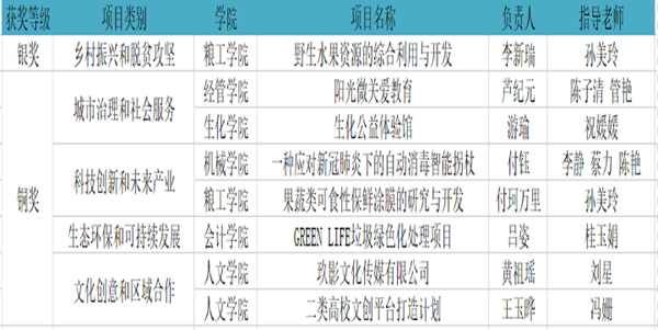 本届大赛聚焦创新、协调、绿色、开放、共享五大发展理念和2020年决战脱贫攻坚、决胜全面小康的目标,设置了科技创新和未来产业、乡村振兴和脱贫攻坚、城市治理和社会服务、生态环保和社会服务、文化创意和区域合作五个组别。大赛启动以来,我校积极组织校赛,助力团队备战,各学院共申报63个创业项目,校团委组织专家进行评选,共遴选出10个项目参加省赛,在省赛备战中,学校还邀请了武汉大学、湖北大学、湖北工业大学等教授专家进行指导。在最终的省赛中,粮食与食品工程学院孙美玲老师指导的《野生水果资源的综合利用与开发》项目获得银奖,会计学院桂玉娟老师指导的《GREEN LIFE垃圾绿色化处理项目》等7个项目获得铜奖。