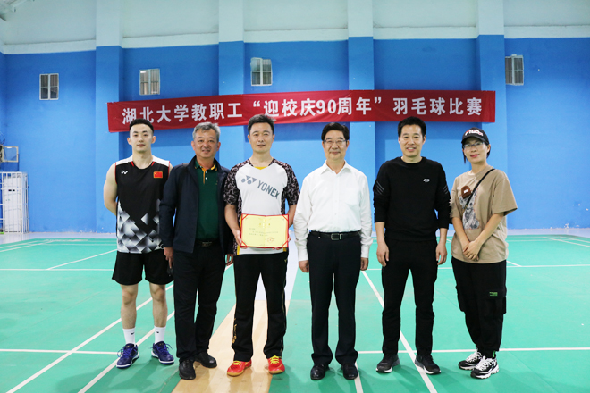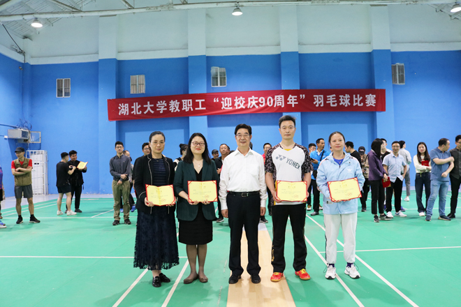 5月26日,湖北大学“迎校庆90周年”教职工羽毛球比赛颁奖仪式在体育馆举行。知行教职工在此次比赛中勇夺第一名,颁奖仪式上,湖北大学副校长钱建国为我校代表队颁奖并合影留念。