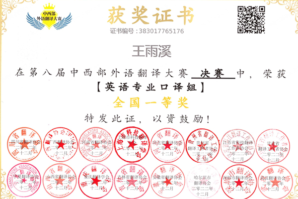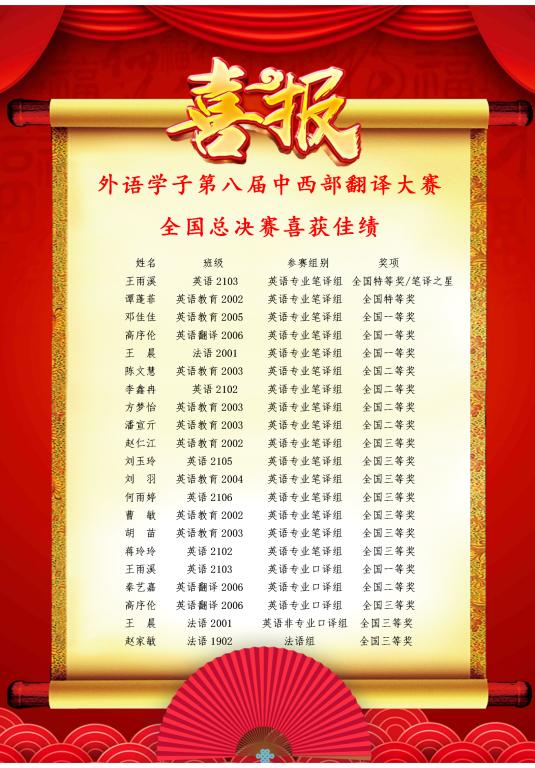 近日,由国内16省翻译协会联合举办的第八届中西部外语翻译大赛结果揭晓,我校外国语学院首次组织学生参赛取得优异成绩,共获得全国大奖21项,其中英语专业笔译组获得全国特等奖2项、全国一等奖3项、全国二等奖4项、全国三等奖7项,英语专业口译组分获全国一、二、三等奖各1项、英语非专业口译组和法语组获得三等奖各1项,英语专业2103班王雨溪同学夺得英语专业笔译组全国决赛“笔译之星”称号。