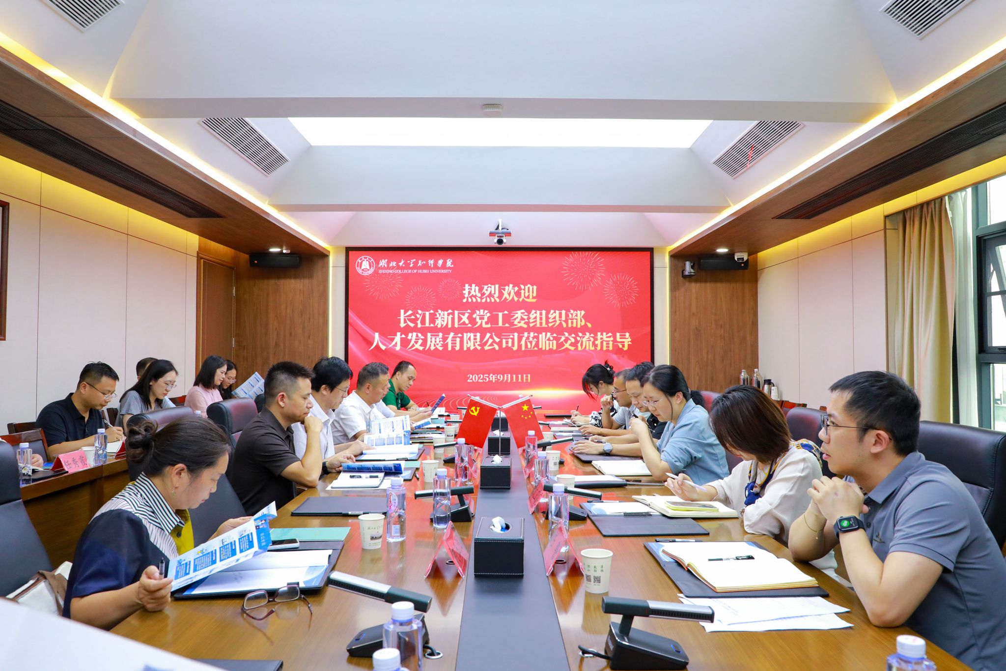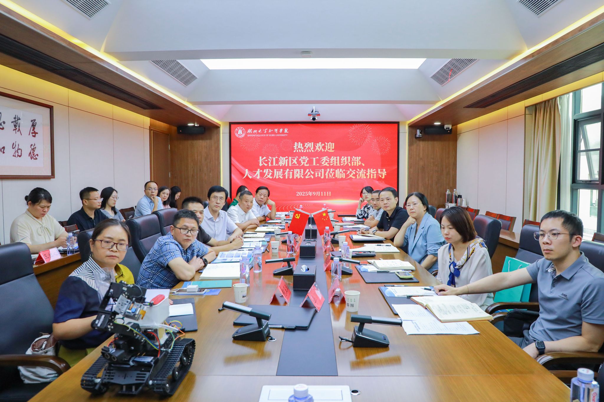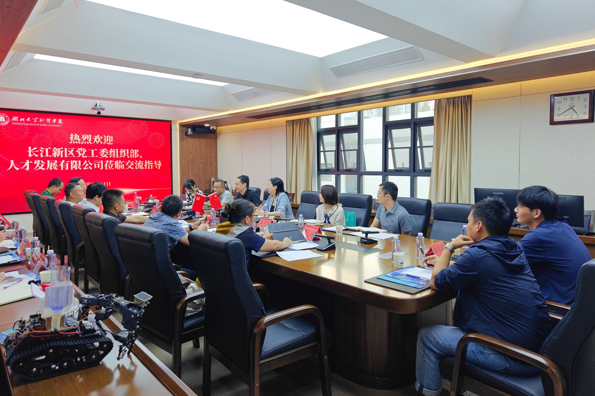 9月11日下午,长江新区党工委组织部副部长杨康、长江新区人才发展有限公司执行董事赵明慧一行来校调研交流。知行学院党委书记高连顺、院长何顺进热情接待了杨康一行。湖北大学新能源与电气工程学院党委书记廖良才、湖北大学人事处副处长刘东和湖北大学材料科学与工程学院、人工智能学院、生命科学学院、智能制造学院、集成电路学院相关负责人和知行学院相关部门负责人参加调研座谈。知行学院院长何顺进主持座谈会。