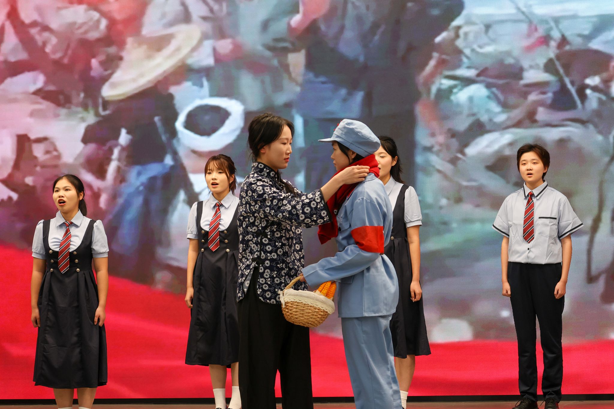 20多个音乐、影视、诵读作品贯穿整场思政课。朗诵《牺牲》回顾了革命先辈不屈斗争的精神伟力,朗诵《等待》阐述了新中国建设者们波澜壮阔的奋斗历程,女生小合唱《十送红军》彰显共产党人自信自强、坚韧不拔的革命精神,舞蹈《鼓声响起的地方》生动展现了中华民族一家亲,歌曲《一起向未来》将十八大以来党和国家的非凡成就一一呈现,歌曲《我和我的祖国》《我爱你中国》表达了知行师生浓浓的家国情怀,赢得现场阵阵掌声。